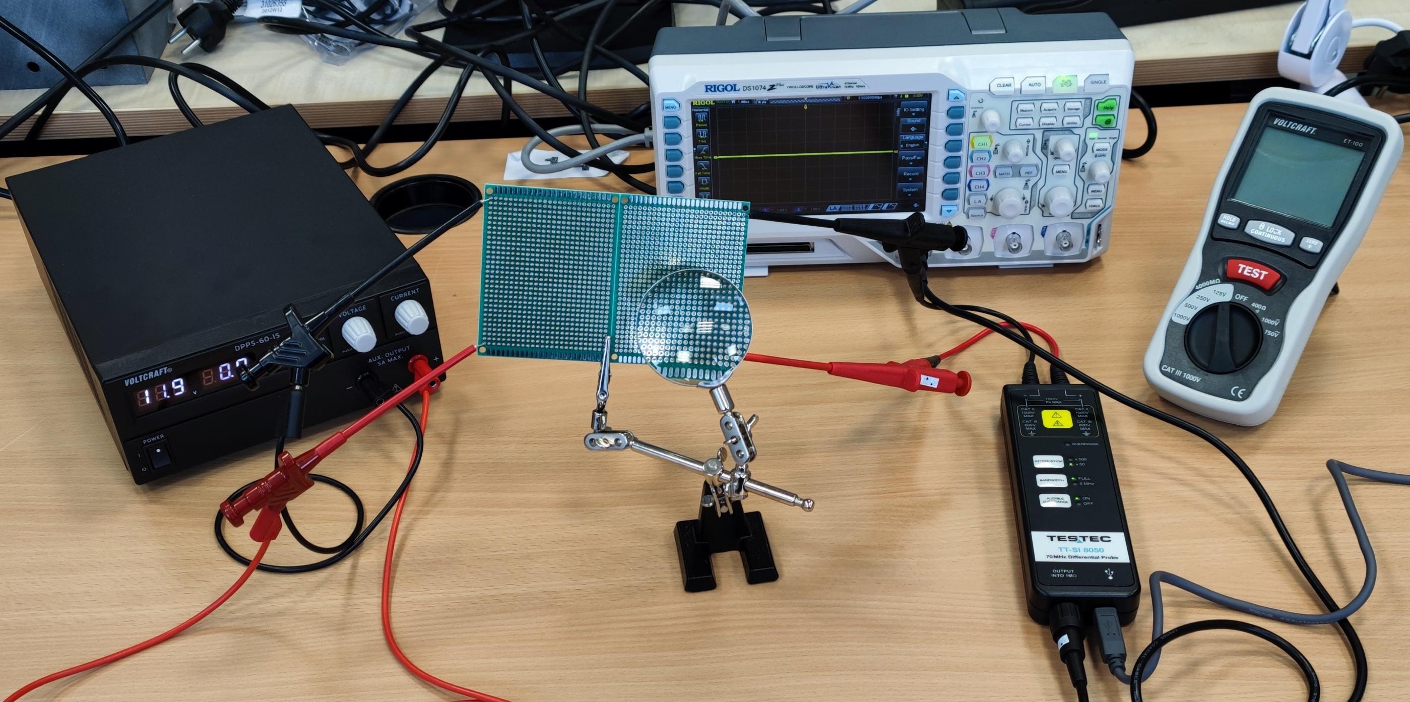 Die so entstandenen Prototypen lassen sich anschließend mittels der Messgeräte charakterisieren. Dazu gehören unter anderem Oszilloskope mit Differentialtastköpfen, Strommesszangen, Rogowskispule, Drehzahlmessgerät, Isolationsmessung, Endoskop, Temperaturmessung, usw.