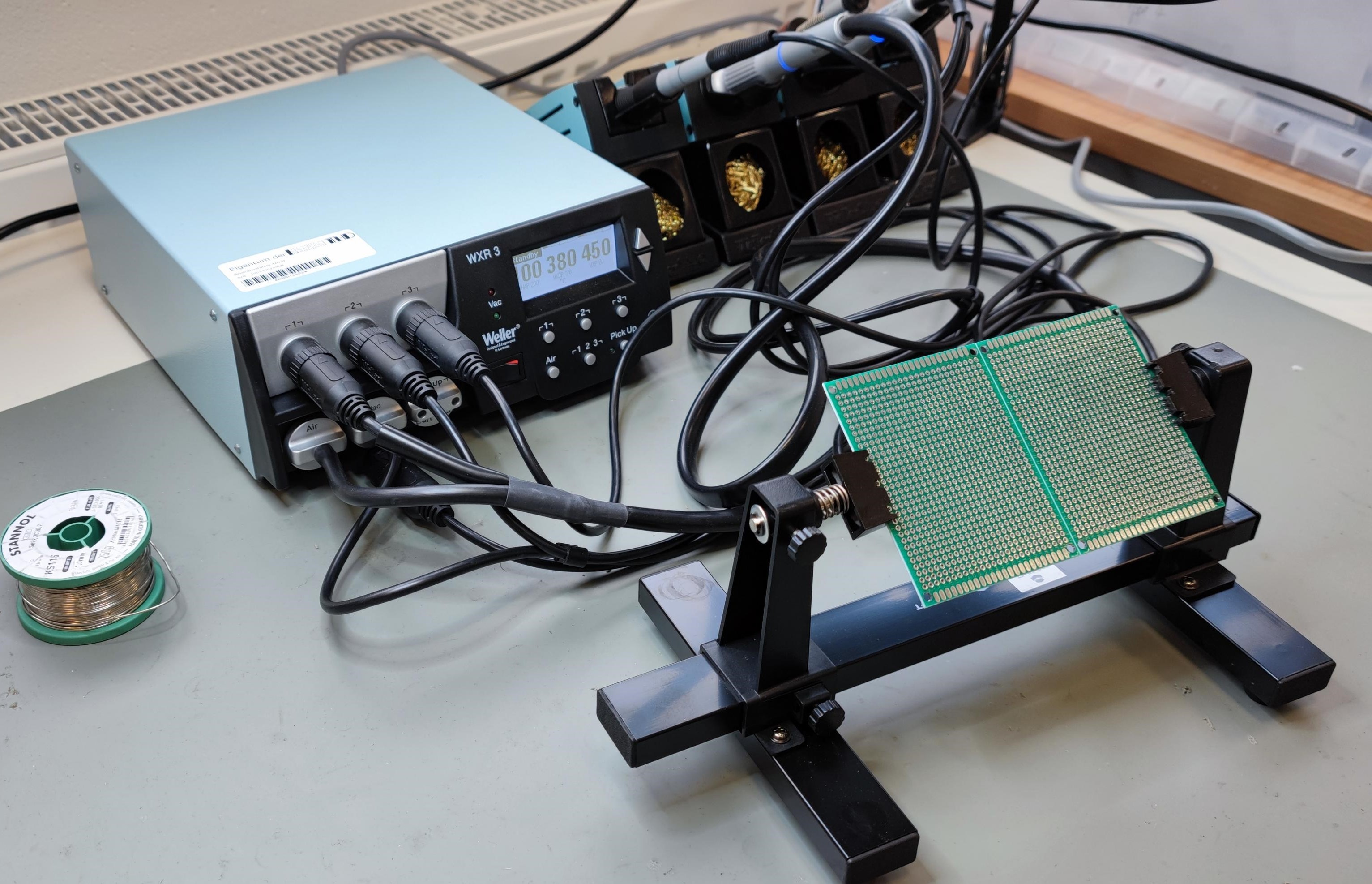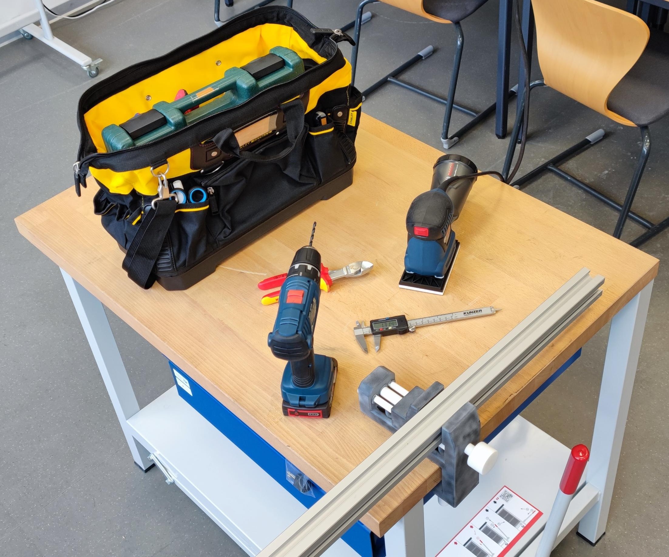 Diverse Werkzeuge zum Bohren, Schleifen, Sägen, Kleben oder Verkabeln sind für Projekte vor Ort vorhanden, um kleine mechatronische Prototypen zu fertigen. Am Lötarbeitsplatz mit Absaugung und Vakuum für Pick-Up-Werkzeuge, können diverse Schaltungen aufgebaut und nachgearbeitet werden. Alternativ stehen Steckboards zur schnellen und einfachen Verdrahtung zur Verfügung.
