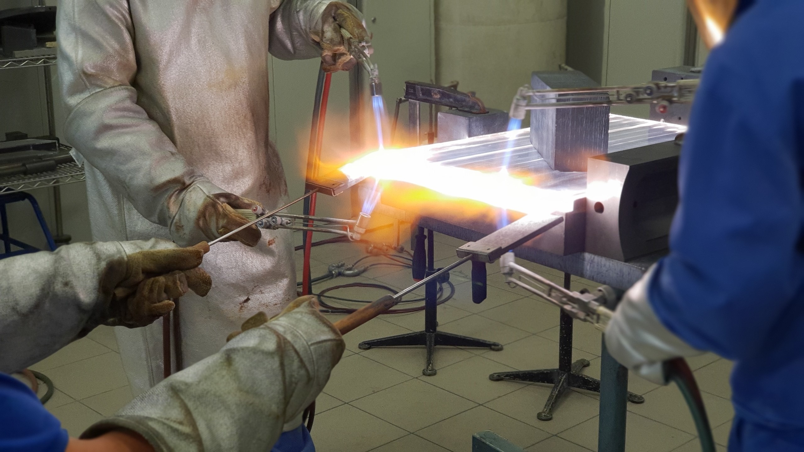 Der Einsatz von Mikrowellen zum Erwärmen ist eine bereits bei anderen Gläsern etablierte Methode. Im Unterschied dazu besteht das Gefüge von Quarzglas bei Raumtemperatur aus α-Quarz. Erst bei etwa 700°C konvertiert dieses α-Quarz zu β-Quarz mit entscheidender Bedeutung für die vorliegende Anwendung. Hier verändert das Quarzglas seine Transmissionseigenschaften, was einen starken Anstieg der Absorption von Mikrowellenstrahlung bedeutet. Im Projekt wurde deshalb ein Prototyp entwickelt, der die Möglichkeit eines zweistufigen Prozesses bietet. Der erste Schritt beinhaltet ein autogenes und dabei definiertes Erhitzen der Quarzplatte mit Linien-Gasbrennern. Die autogene Vorwärmung erfolgt mit einem Gasgemisch aus Wasserstoff und Sauerstoff, um Adsorbate am Quarzglas für dessen spätere Verwendung zu vermeiden. Im zweiten Schritt erfolgt das Aufheizen mittels Mikrowellen bis zur Biegetemperatur. Kernelement für diesen Schritt ist der verwendete Mikrowellen-Generator, der ein Magnetron ansteuert. Dieses liefert Mikrowellen mit einer Frequenz von 2,45GHz und einer Mikrowellenleistung von bis zu 1250W. Um die Mikrowellen-Leistung an der Oberfläche des Quarzglases auch optimal einkoppeln zu können, erfolgte eine Simulation der Mikrowellen-Antenne mit der Software Comsol in einer Multiphysik-Simulationsumgebung. Diese Simulation brachte Aussagen zur Intensitäts-Verteilung des elektromagnetischen Feldes und letztlich für die Erwärmung der Quarzglasplatte. Es wurden drei Geometrien von Mikrowellen-Antennen mit am Antennenaustritt zunehmend steigender Mikrowellen-Leistung (Faktor 10 für eine Fächerhornantenne) erprobt. Ein weiterer Steigerungsfaktor 10 wird bei Einschnürung der Mikrowellen-Antenne auf den unmittelbaren Biegebereich erwartet. Die Temperaturmessung während der autogenen Vorwärmung des Quarzglases erfolgte strahlungs-pyrometrisch. Das beim Transfer in die Mikrowellen-Aufheizposition verstreichende Zeitfenster wird dabei genutzt, um die Mikrowellen im Innern der Quarzplatte absorbieren zu lassen.