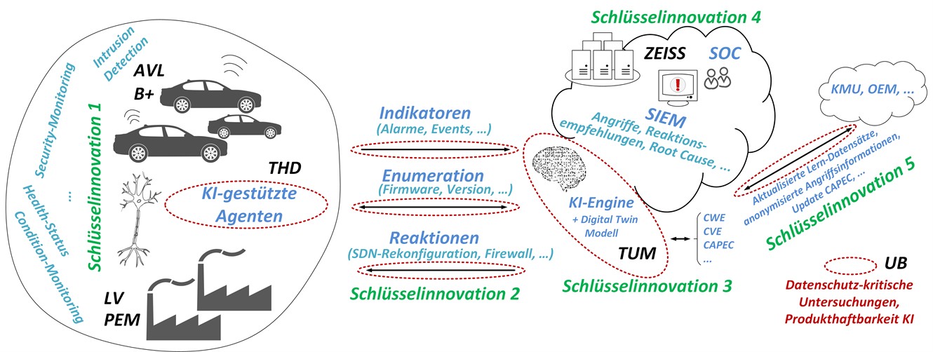 Die zunehmende Vernetzung von Komponenten bietet auch Chancen für neuartige und umfassende Ansätze zur effizienten Erkennung und Behandlung von Cybersicherheitsvorfällen mittels Künstlicher Intelligenz (KI). Die Kernidee des Projekts SKINET ist die Anwendung entsprechender Methoden in verschiedenen Szenarien für vernetzte IT-Systeme mit cyberphysikalischen Komponenten. Dazu werden im Projekt zum einen bei Autos mit Anbindung an ein Hintergrundsystem zur Datenverarbeitung und zum anderen in vernetzten industriellen Fertigungsanlagen sicherheitskritische Vorfälle und deren Ursachen analysiert. Basierend auf den Analyseergebnissen wird ein Modell entwickelt, in dem mittels KI eine effektive Erkennung und Behandlung von Sicherheitsvorfällen ermöglicht wird. Neben der bloßen Benachrichtigung von verantwortlichen Personen im Angriffsfall, sollen automatisch geeignete Reaktionen vorgeschlagen oder selbstständig eingeleitet werden können, um bestmögliche Sicherheit und Verfügbarkeit zu erzielen