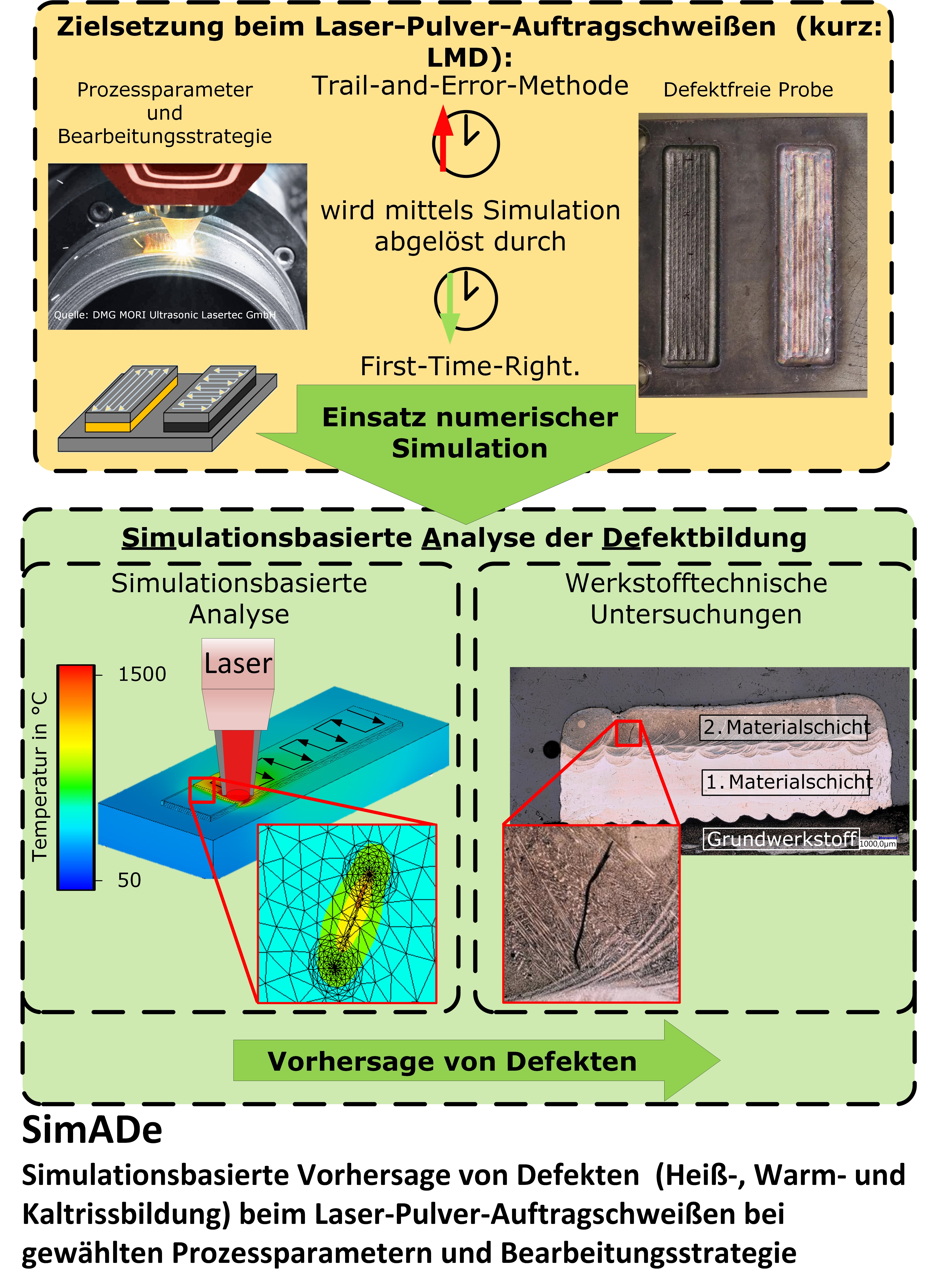 Das Ziel des Vorhabens ist die Ermittlung des Einflusses der Prozesscharakteristika auf die Entstehung von Defekten beim LMD-Verfahren an zwei ausgewählten Materialsystemen. Zudem sollen Ansätze zur simulationsbasierten Analyse der Defektentstehung untersucht werden.