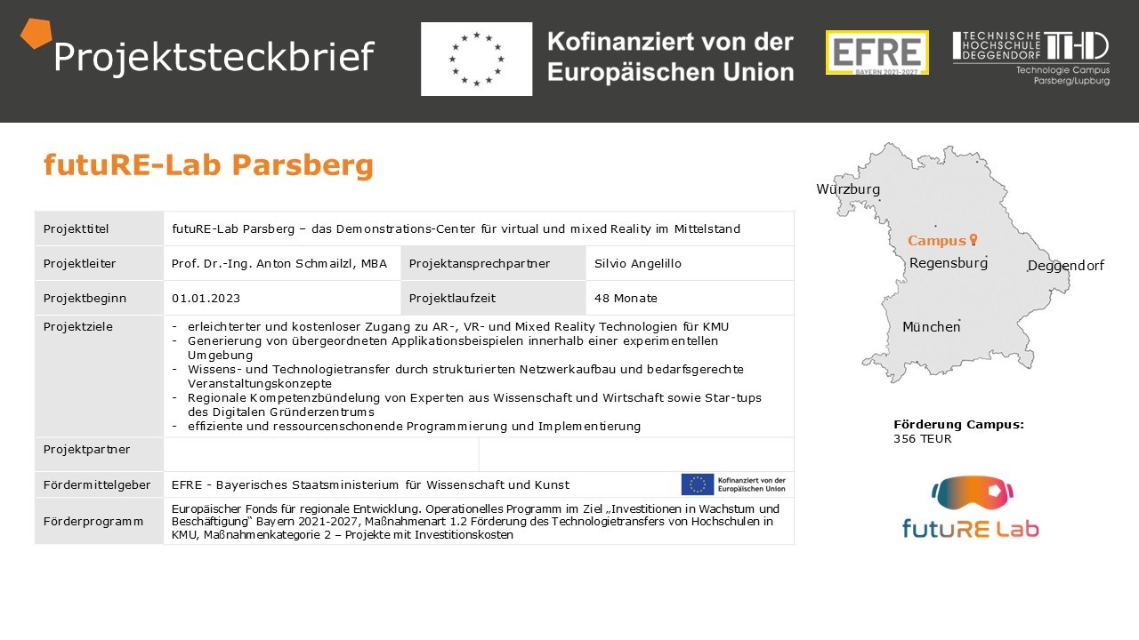Im neu geplanten futuRE-Lab Parsberg – das Demonstrations-Center für virtual und mixed reality im Mittelstand - des Technologie Campus Parsberg-Lupburg soll kleinen und mittelständischen Unter-nehmen aus strukturschwachen Regionen, die bisher wenig bis keinen Bezug zu dieser Technologie haben, die Möglichkeit gegeben werden, von den Forschungs- und Innovationskapazitäten der Cam-pus Hochschulen TH Deggendorf und OTH Regensburg sowie den innovativen Startups des ansässi-gen Digitalen Gründerzentrums profitieren und partizipieren zu können. Das futuRE-Lab bietet die Möglichkeit sich durch dort gezeigte Anwendungsbeispiele und Simulationen über die Technologie zu „Investitionen in Wachstum und Beschäftigung“ Bayern 2021- 2027 Förderung des Technologietransfers von Hochschulen in KMU Maßnahmenkategorie 2 - Projekte mit Investitionskosten Seite 3 von 5 informieren, sich mit der technischen Ausstattung auseinanderzusetzen, diese kostenlos zu testen, auszuleihen und sich Kenntnisse über die technologischen Möglichkeiten und vielfältigen Anwendungsbereiche von AR und VR anzueignen und ins eigene Unternehmen zu transferieren. In zielgruppengerechten Workshopformaten (Online und Präsenz) soll das Wissen und die Möglichkeiten um die Technologie den Firmen nahegebracht, Anwendungsbeispiele aufgezeigt und die individuellen Bedarfe der einzelnen Unternehmen eruiert und weiterentwickelt werden. Im futuRE-Lab könnten somit Anwendungen simuliert werden, die eine Transformation von konventionellen Aus- und Weiterbildungen bezwecken soll.