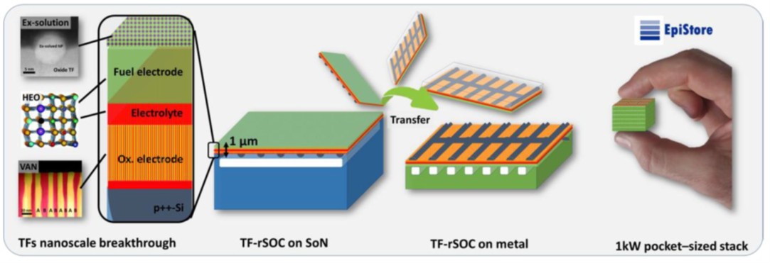 Die moderne Dünnschichttechnologie hat mehrere technologische Innovationen in den Bereichen Elektronik und Beleuchtung realisiert, indem sie herausragende nanoskalige Phänomene in zuverlässigen Produkten mit einem sehr geringen Gehalt an kritischen Rohstoffen ermöglicht. Das EU-finanzierte Projekt EPISTORE wird Stacks im Taschenformat im Kilowattbereich entwickeln, die auf reversiblen Dünnschicht-Festoxidzellen basieren, um erneuerbare Elektrizität effizient für Anwendungen zu speichern, bei denen der Einsatz von Batterien unzureichend ist. Das Projekt wird nanoskalige Fortschritte und noch zu erforschende Materialien mit bahnbrechenden reversiblen Dünnschicht-Festoxidzellen kombinieren, um neue ultrakompakte und reaktionsschnelle Strom-zu-Gas- und Strom-zu-Strom-Speicherlösungen mit hoher Leistung und geringem Einsatz von kritischen Rohstoffen zu ermöglichen. Reversible Dünnschicht-Festoxidzellen werden mit skalierbarer Siliziumtechnologie als potenziell kostengünstiges Modell für die Energiespeicherung im großen Maßstab eingesetzt.
